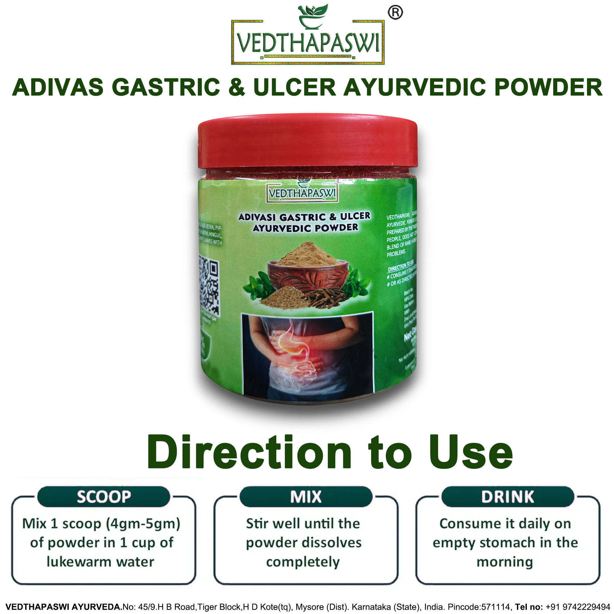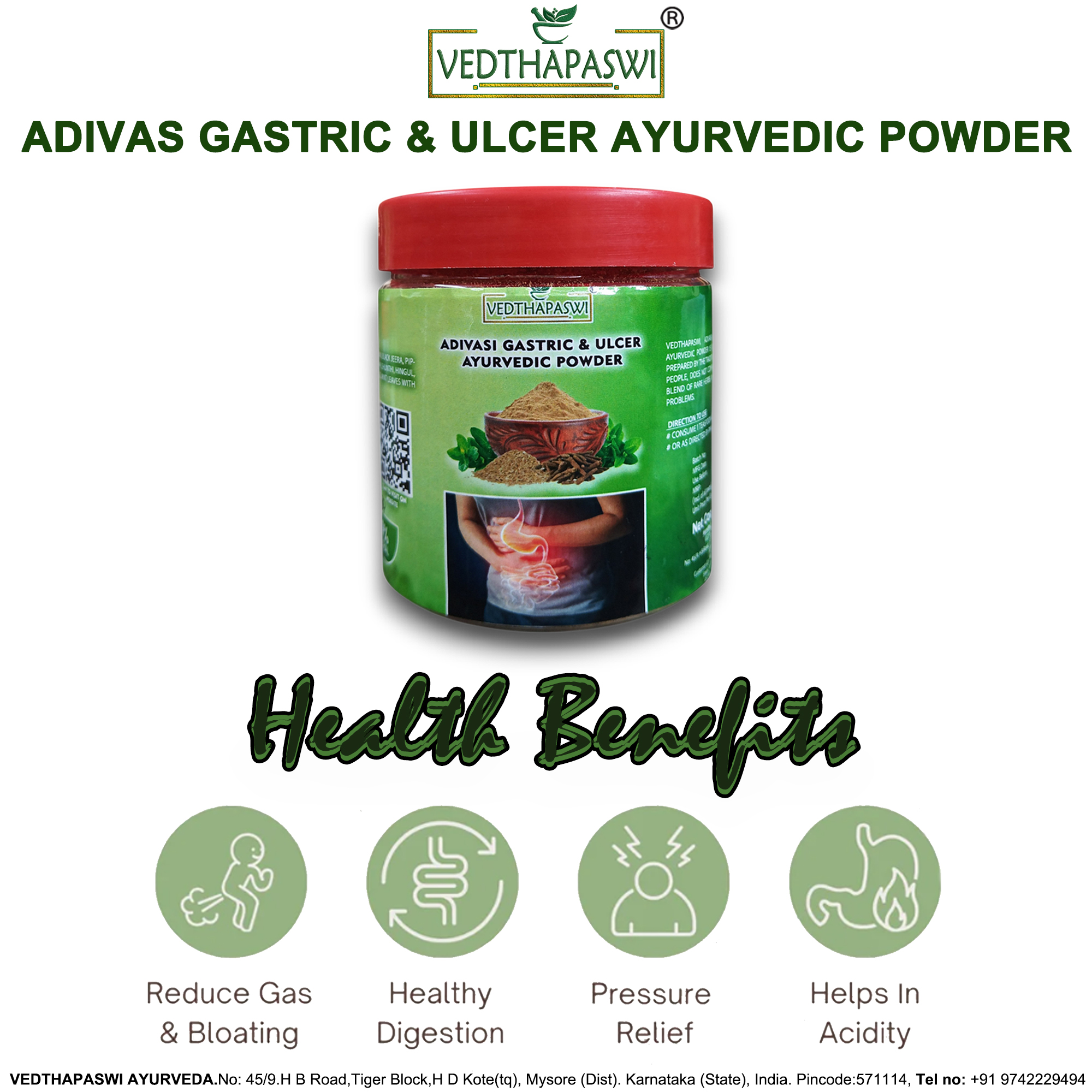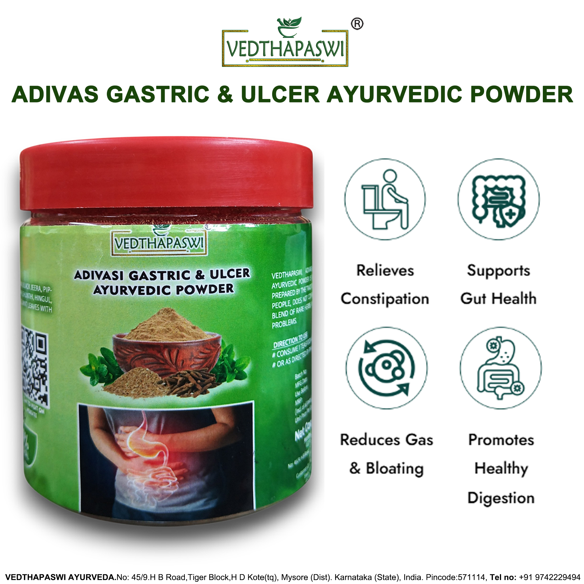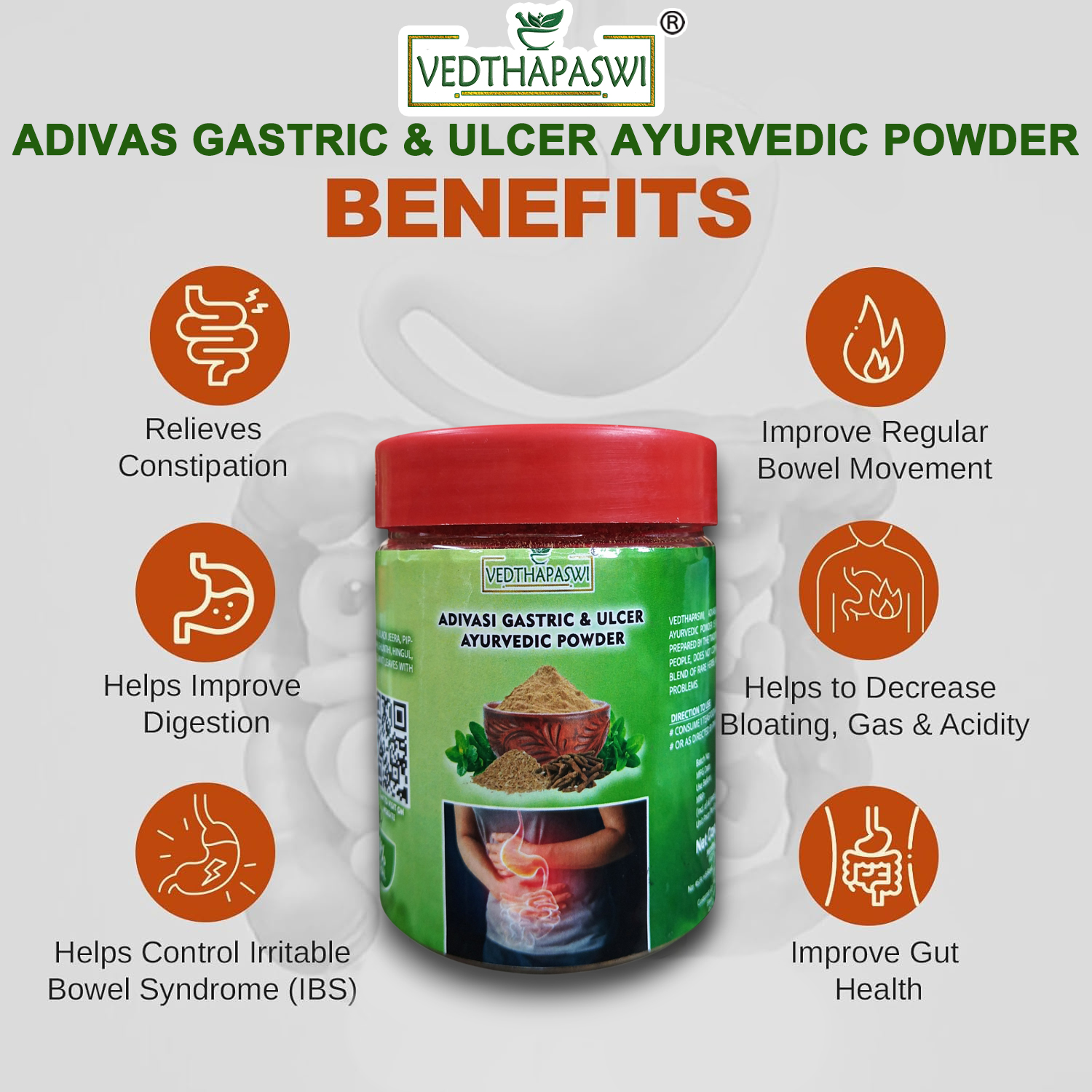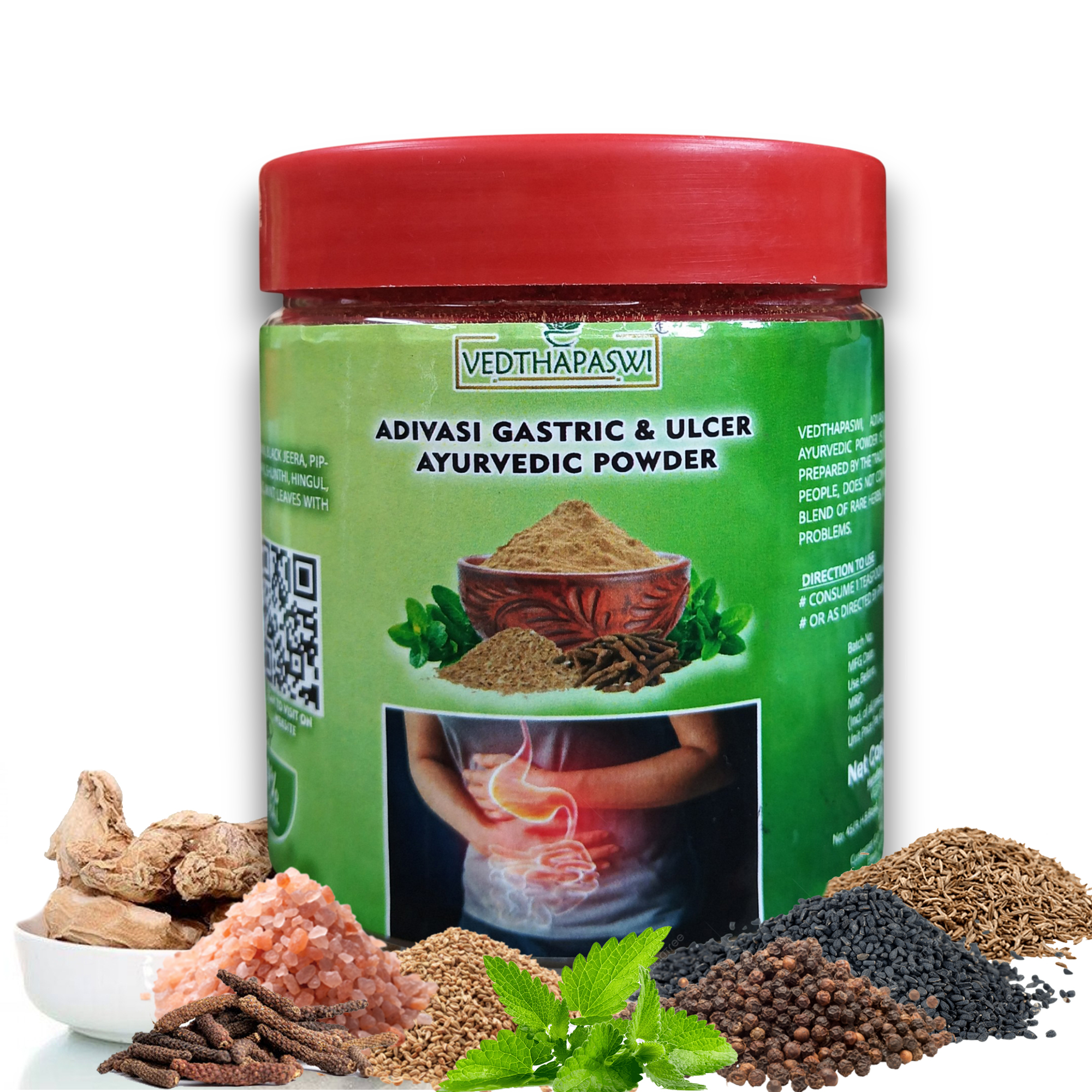 Vedthapaswi, Adivasi Gastric and Ulcer Ayurvedic Powder is 100% Ayurvedic herbal, prepared by the traditional method of tribal people, does not contain any chemicals, is a blend of rare herbs, which relieves stomach problems.